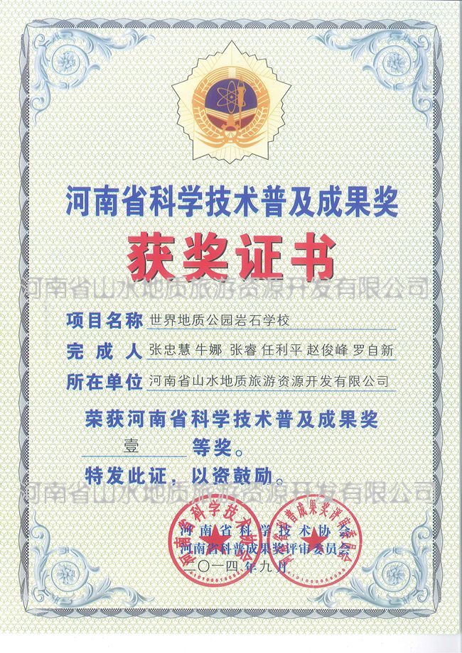 為深入實施科教興豫、人才強省戰略,調動社會各界關注、支持、參與科普工作的積極性,河南省科協組織開展了2014年河南省科學技術普及成果獎申報工作,推薦單位為各級科協、全省各學會(協會、研究會)和省直、中央駐豫有關部門及有關單位,河南省科協成立河南省科普成果獎專家評審委員會對參評項目進行評審,對獲獎項目的實施單位或完成人進行表彰,并頒發獎牌、證書。我公司報送了科普讀物《世界地質公園巖石學校》參加評選。經過河南省國土廳初評、河南省科普成果獎專家評審委員會的復核評審,我公司報送的《世界地質公園巖石學校》獲得2014年河南省科學技術普及成果獎一等獎。