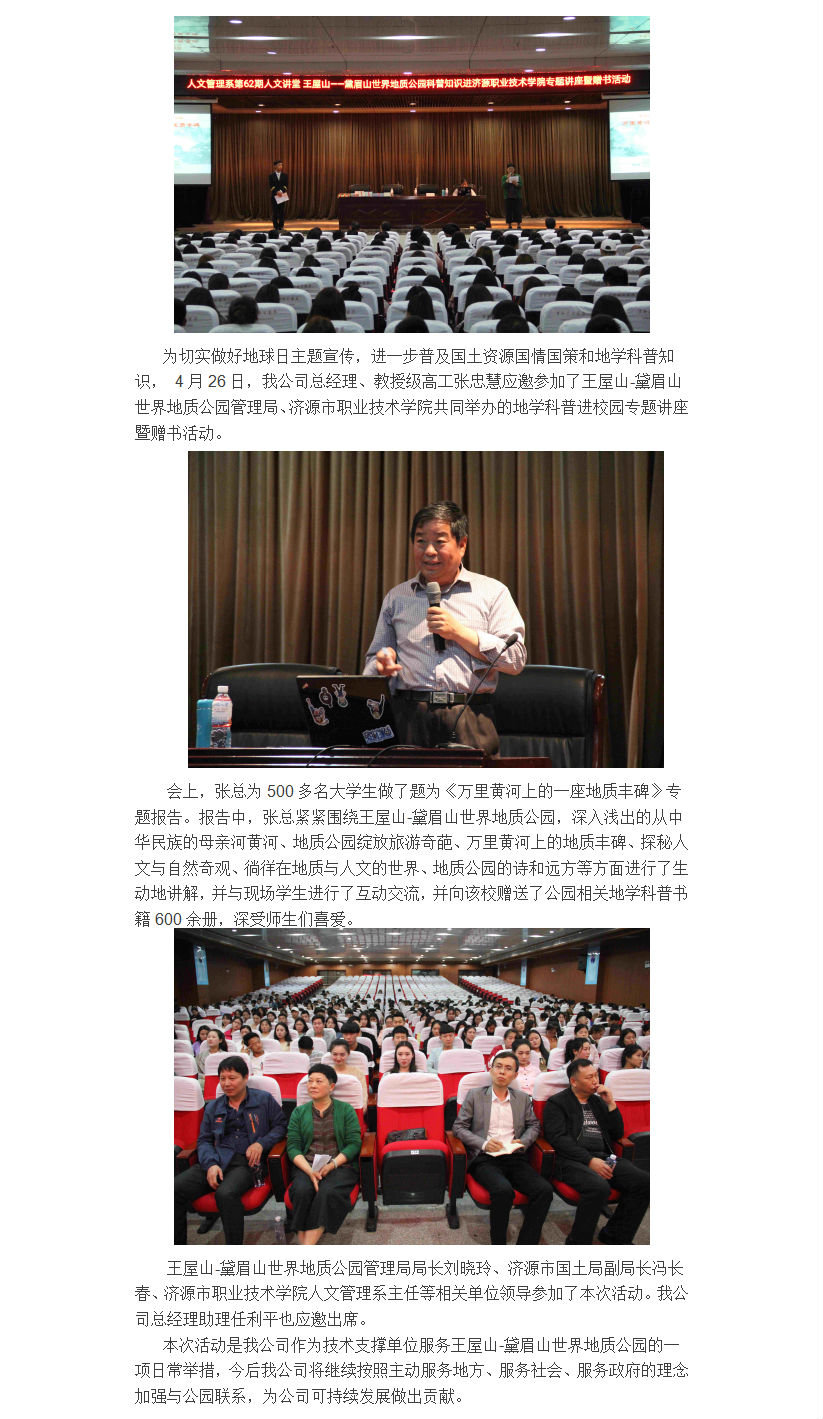 我公司應邀參加王屋山-黛眉山世界地質公園地學科普進校園專題講座暨贈書活動
