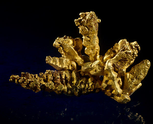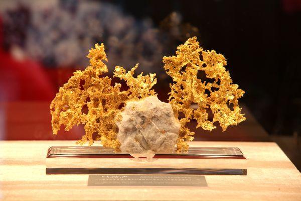 【自然金】晶體屬等軸晶系的一種自然元素礦物,自然金通常呈樹枝狀、粒狀或鱗片狀,較少呈不規則的大塊狀,產于原生礦床中的自然金俗稱山金,產于礦床的叫脈金,產于砂礦中的叫做沙金。在海水中也存在著自然金,
