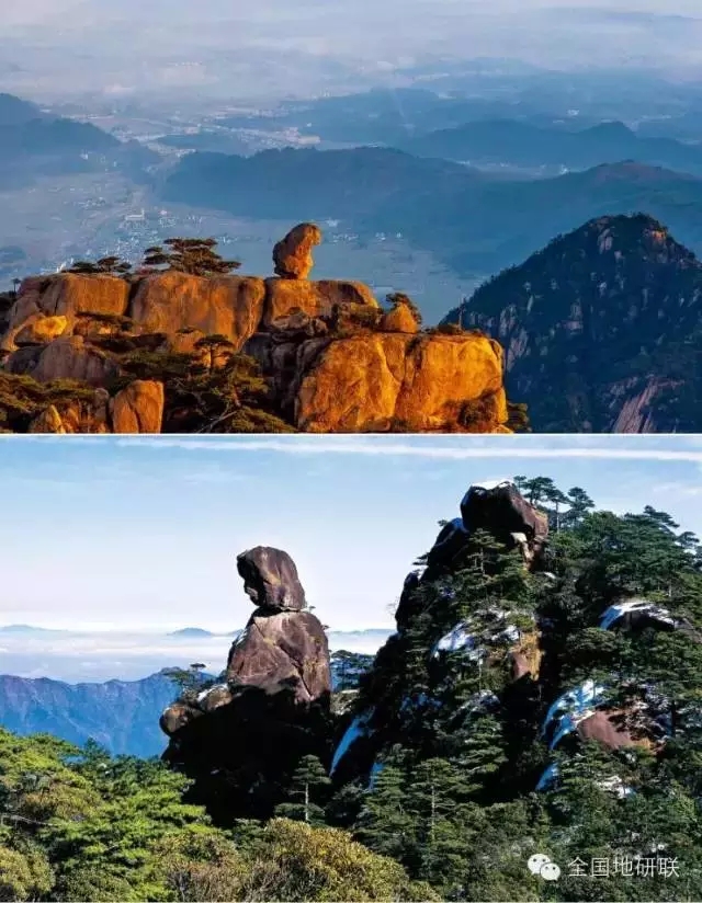 不(bu)(bu)知你注意(yi)到沒有(you)(you),這(zhe)些(xie)山(shan)也有(you)(you)“石(shi)(shi)(shi)(shi)蛋(dan)”,不(bu)(bu)過(guo)(guo)這(zhe)些(xie)“石(shi)(shi)(shi)(shi)蛋(dan)”不(bu)(bu)是(shi)(shi)立在(zai)(zai)地(di)(di)(di)上,堆在(zai)(zai)山(shan)坡,而是(shi)(shi)被(bei)(bei)(bei)(bei)高(gao)高(gao)舉(ju)起,舉(ju)在(zai)(zai)了一些(xie)陡(dou)(dou)峭石(shi)(shi)(shi)(shi)峰(feng)(feng)的(de)(de)(de)頂(ding)端,成為(wei)了峰(feng)(feng)頂(ding)之石(shi)(shi)(shi)(shi)。如(ru)黃山(shan)的(de)(de)(de)著(zhu)名景點——猴(hou)子(zi)觀海(hai)、鰲魚負龜(gui)、飛來(lai)(lai)(lai)石(shi)(shi)(shi)(shi)等;三(san)清山(shan)的(de)(de)(de)司春女神、猴(hou)王獻寶(bao)等;以及天(tian)柱山(shan)的(de)(de)(de)一些(xie)象形石(shi)(shi)(shi)(shi),都(dou)是(shi)(shi)原來(lai)(lai)(lai)風(feng)(feng)化(hua)殼(ke)中(zhong)的(de)(de)(de)石(shi)(shi)(shi)(shi)蛋(dan)。這(zhe)些(xie)被(bei)(bei)(bei)(bei)高(gao)高(gao)舉(ju)在(zai)(zai)峰(feng)(feng)頂(ding)的(de)(de)(de)石(shi)(shi)(shi)(shi)蛋(dan),其實也曾經在(zai)(zai)地(di)(di)(di)下,被(bei)(bei)(bei)(bei)埋在(zai)(zai)花崗(gang)巖風(feng)(feng)化(hua)殼(ke)的(de)(de)(de)最(zui)下層(ceng)。后來(lai)(lai)(lai)由于地(di)(di)(di)殼(ke)進(jin)入(ru)(ru)了抬(tai)(tai)升(sheng)(sheng)(sheng)階段,風(feng)(feng)化(hua)殼(ke)隨著(zhu)地(di)(di)(di)殼(ke)的(de)(de)(de)抬(tai)(tai)升(sheng)(sheng)(sheng)被(bei)(bei)(bei)(bei)不(bu)(bu)斷地(di)(di)(di)剝(bo)蝕,其中(zhong)的(de)(de)(de)紅色土層(ceng),最(zui)先被(bei)(bei)(bei)(bei)降水等沖刷(shua)干凈;接下來(lai)(lai)(lai)有(you)(you)少量石(shi)(shi)(shi)(shi)蛋(dan)的(de)(de)(de)砂礫層(ceng)也被(bei)(bei)(bei)(bei)沖刷(shua)得無(wu)影無(wu)蹤;隨著(zhu)這(zhe)個(ge)(ge)過(guo)(guo)程(cheng)的(de)(de)(de)深(shen)入(ru)(ru),整個(ge)(ge)風(feng)(feng)化(hua)殼(ke)的(de)(de)(de)上部分都(dou)被(bei)(bei)(bei)(bei)清除了,只有(you)(you)石(shi)(shi)(shi)(shi)蛋(dan)和石(shi)(shi)(shi)(shi)蛋(dan)層(ceng)殘留(liu)著(zhu)。隨著(zhu)地(di)(di)(di)殼(ke)繼續強(qiang)(qiang)烈的(de)(de)(de)抬(tai)(tai)升(sheng)(sheng)(sheng),過(guo)(guo)去位于風(feng)(feng)化(hua)殼(ke)以下未風(feng)(feng)化(hua)的(de)(de)(de)新鮮花崗(gang)巖開始進(jin)入(ru)(ru)風(feng)(feng)化(hua)過(guo)(guo)程(cheng),由于地(di)(di)(di)殼(ke)進(jin)入(ru)(ru)了強(qiang)(qiang)烈的(de)(de)(de)抬(tai)(tai)升(sheng)(sheng)(sheng)階段,花崗(gang)巖中(zhong)的(de)(de)(de)垂直節理在(zai)(zai)風(feng)(feng)化(hua)中(zhong)開始發揮舉(ju)足輕重的(de)(de)(de)作(zuo)用,流(liu)水順著(zhu)垂直節理向下深(shen)入(ru)(ru),巖石(shi)(shi)(shi)(shi)被(bei)(bei)(bei)(bei)流(liu)水切割(ge)成一個(ge)(ge)個(ge)(ge)陡(dou)(dou)峻的(de)(de)(de)巖柱、巖峰(feng)(feng),這(zhe)就是(shi)(shi)我們(men)今天(tian)在(zai)(zai)黃山(shan)、三(san)清山(shan)、天(tian)柱山(shan)看到的(de)(de)(de)那些(xie)崢嶸(rong)挺拔的(de)(de)(de)山(shan)峰(feng)(feng),不(bu)(bu)過(guo)(guo)在(zai)(zai)有(you)(you)的(de)(de)(de)山(shan)峰(feng)(feng)的(de)(de)(de)頂(ding)端可能會有(you)(you)古老的(de)(de)(de)風(feng)(feng)化(hua)殼(ke)中(zhong)的(de)(de)(de)石(shi)(shi)(shi)(shi)蛋(dan)殘留(liu),這(zhe)石(shi)(shi)(shi)(shi)蛋(dan)就是(shi)(shi)那猴(hou)子(zi)、烏(wu)龜(gui)、女神……