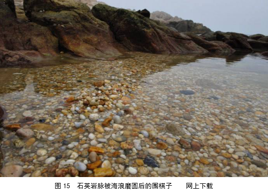 在海岸(an)礁石(shi)之(zhi)間,發育了一系(xi)列規模不等(deng)的(de)(de)(de)礫(li)(li)石(shi)灘(tan),由直徑(jing)幾厘米(mi)的(de)(de)(de)大小不等(deng)的(de)(de)(de)礫(li)(li)石(shi)組(zu)成,這(zhe)些小礫(li)(li)石(shi)多是(shi)花崗巖中發育的(de)(de)(de)石(shi)英脈(mo)風化(hua)成棱角(jiao)狀礫(li)(li)石(shi)后,又(you)被海水(shui)沖刷成渾圓狀。有趣的(de)(de)(de)是(shi),這(zhe)些小礫(li)(li)石(shi)的(de)(de)(de)顏色主要為淺色和深色兩種(zhong),就像(xiang)圍(wei)棋的(de)(de)(de)黑(hei)白(bai)子(見圖(tu)14、15)。